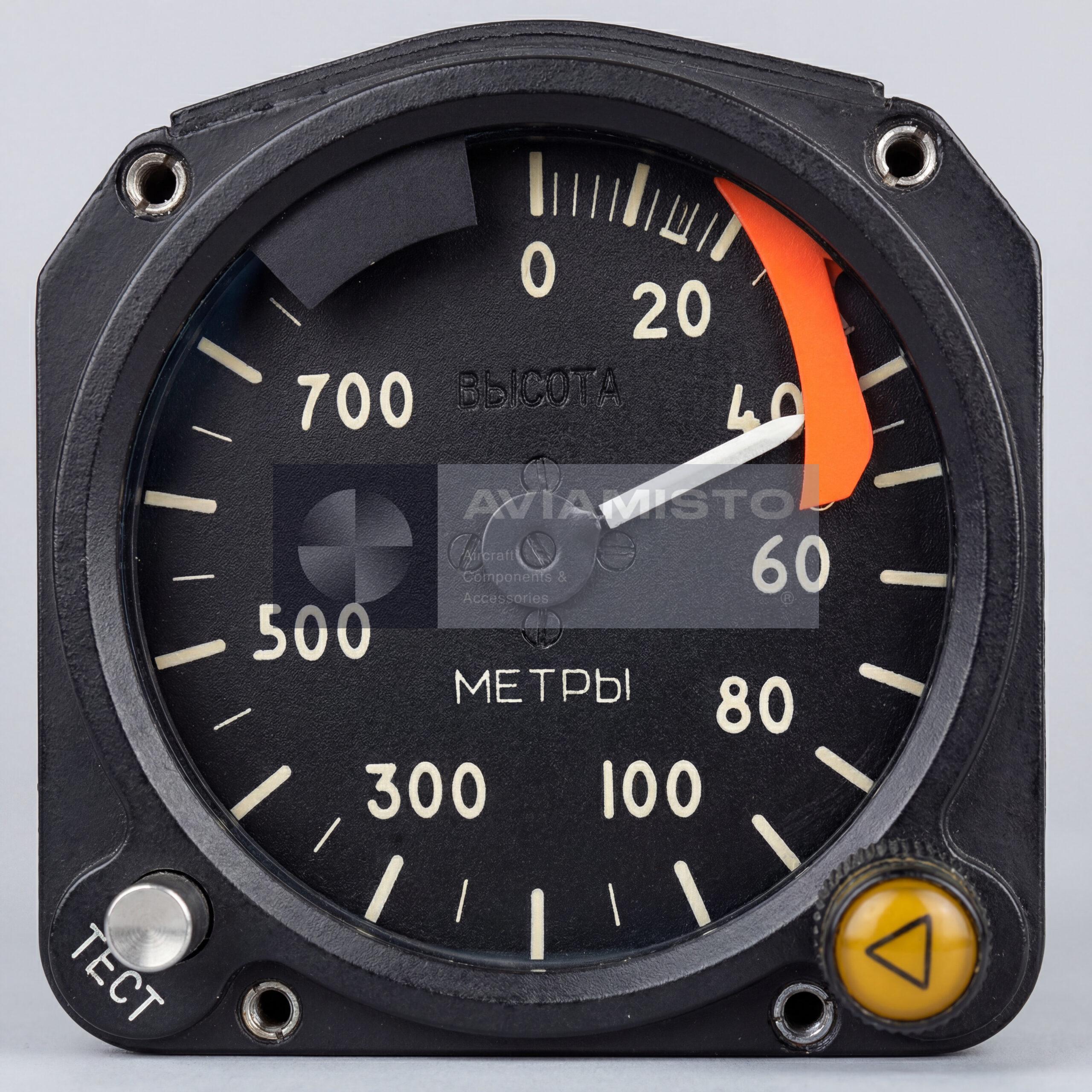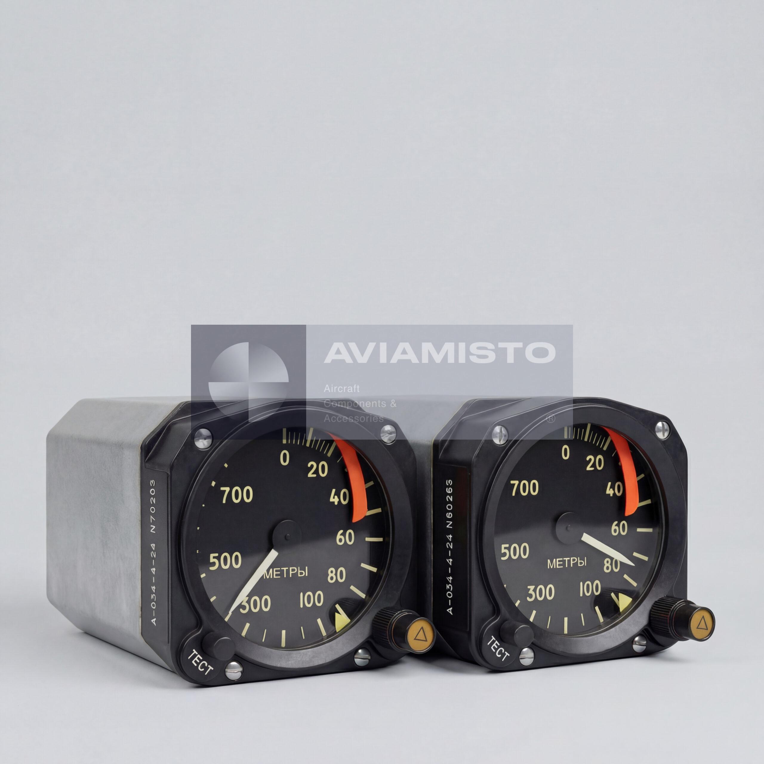 The Altitude Indicator A-034-4-24 is a pointer-type display instrument used in the RV-5M and A-037 radio altimeter systems to show the true height of an aircraft above ground or water.