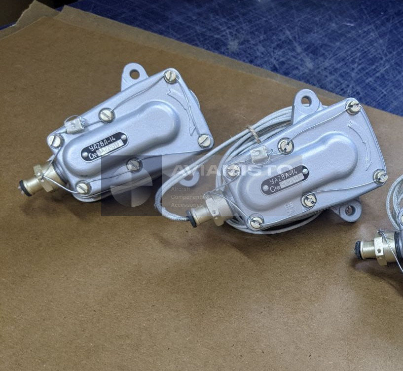 The UA28A-14 sensor is used in aircraft anti-skid braking systems installed on aircraft such as An-24, An-26 and L-410. In standard configurations the UA28A-14 sensor is installed on the right landing gear wheel, while the UA28A-13 sensor is installed on the left wheel.