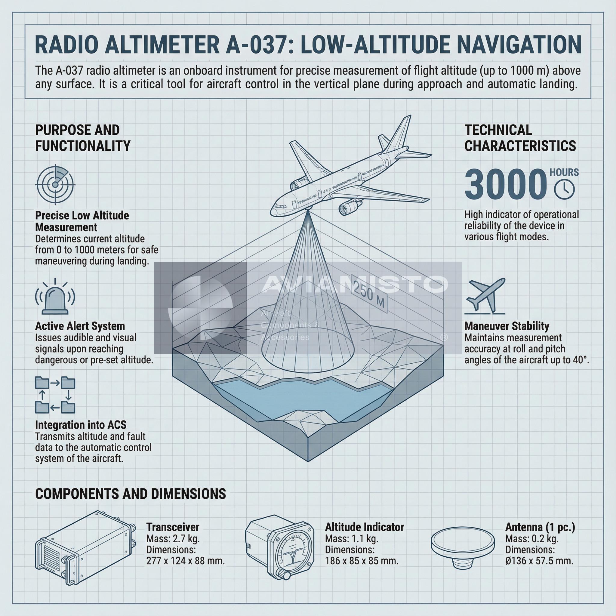 Радиовысотомер А-037 вариант 4 представляет собой комплект авиационной аппаратуры, предназначенный для точного измерения истинной текущей высоты полёта вертолёта над любой поверхностью — сушей, водой или пересечённым рельефом.